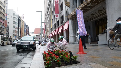 このたび、はな街道と同様の活動・志を持つ地域との交流を通して連携の強化、相互の街道の知名度アップを図ると共に、「全国のみちの起点」である日本橋から全国へ情報発信したいと考え、群馬県立中之条高校の将来の地域の活性化を担う世代の高校生と、現在植栽活動を行っている『浅間・白根・志賀 さわやか街道』の方々に日本橋へお越しいただき、合同で植栽活動を実施いたしました。