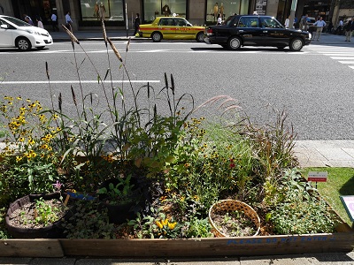江戸時代から交通の要所で文化の中心でもあった日本橋界隈。人々がお洒落をして往来していた様子を着物の帯で表現、組合せる草花を工夫し現代にも通じる小粋な秋の花壇に。 |