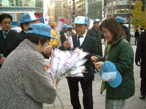 師走の日本橋を忙しく歩かれる方へバラ・カーネーション・ガーべラ・など色とりどりのお花を差し出すとふと足を止めて頂け「え?いいんですか?」と一瞬驚かれて笑顔がこぼれるが温かくなる光景でした。 |